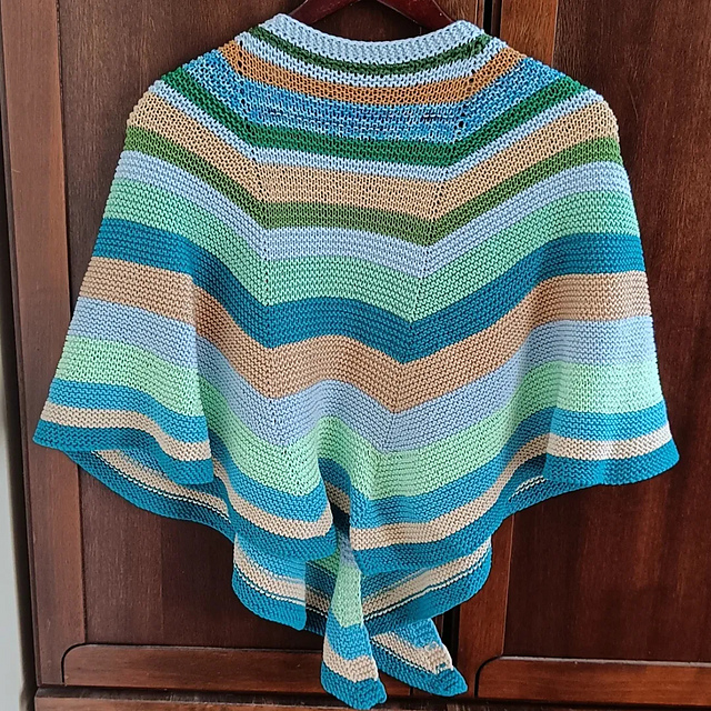 очень понравились нитки Concept by Katia Pure, 100% хлопок, но мягчайшие! их один моточек был, также один моток тонких Katia Fair Cotton, которые пошли в две нити, два мотка голубых Gazzal Baby Cotton XL я распределила по всей шали... и что-то без этикетки бирюзового цвета, по ощущениям простой, грубый хлопок. из собственных остатков я вынула все голубые, зелёные и бежевые. получилось что-то весеннее, весёлое и лёгкое. в описании на Раве я сделала полную выкладку, что за чем. всего 18 полос, использованы 13 видов ниток.